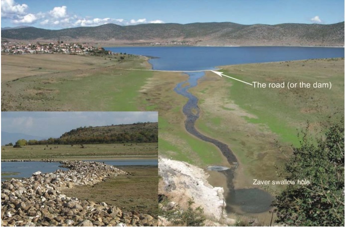 Figure 2. The “dam” in front of the Zavir Abyss near the village of Dolna Gorica in Albania, visible only at low water levels. Source: Eftimi 2019[6]